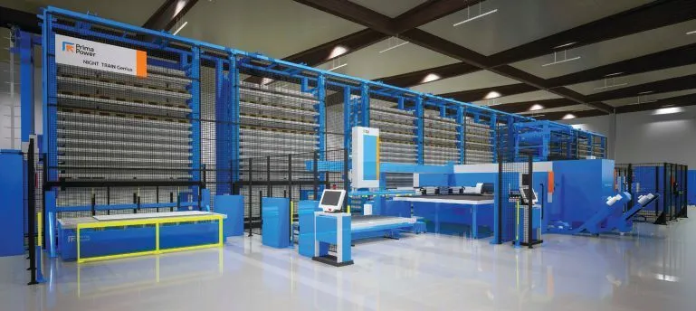 Below Prima Power’s Night Train system enables 24/7, lights-out production by automatically handling material storage, feeding machines (laser cutters, punch presses, benders), and sorting finished parts.